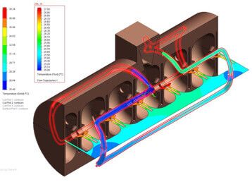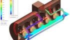 Medical Linear Accelerators for radiation therapy require precise temperature control to ensure that the proper dose is delivered during oncology treatment. The image to the left is from a simulation using computational fluid dynamic software to determine the thermal profile gradient through the accelerating cavity structure with chilled pressurized water flowing through the brazed copper assembly.