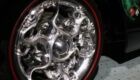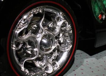 Front and rear tire rims were requested from CAElliott for this 1959 Corvette Convertible show car with dragons for spokes. The wheels were machined from upset forged billets of 6061 Aluminum after a lengthy session in the design studio with clay models and Pro/ENGINEER MCAD from PTC.